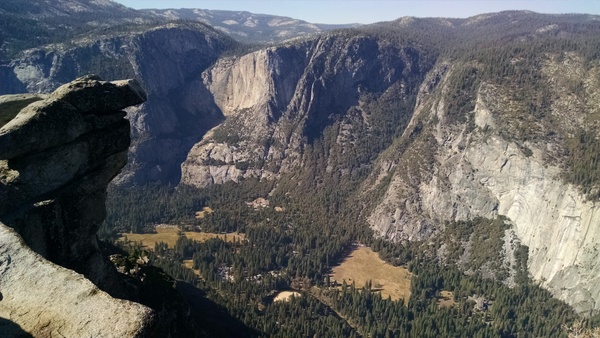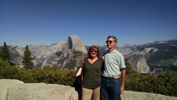 As we started the drive up into Yosemite, the temperature was 89 degrees. The hillsides became more green with pine trees although sadly, many of them are dying due to drought stress and the pine bark beetles. Our first main stop in the park was at Glacier Point which overlooks the Yosemite Valley thousands of feet below and Half Dome on the other side of the valley. The only words to describe it are "awe inspiring". The temperature had dropped to a comfortable 69 degrees. The downside is the huge crowds that have come to enjoy this awe-inspiring experience. On the way down there is an overlook with a spectacular view of the El Capitan on the left, the Yosemite Valley in the middle and Half Dome on the right.